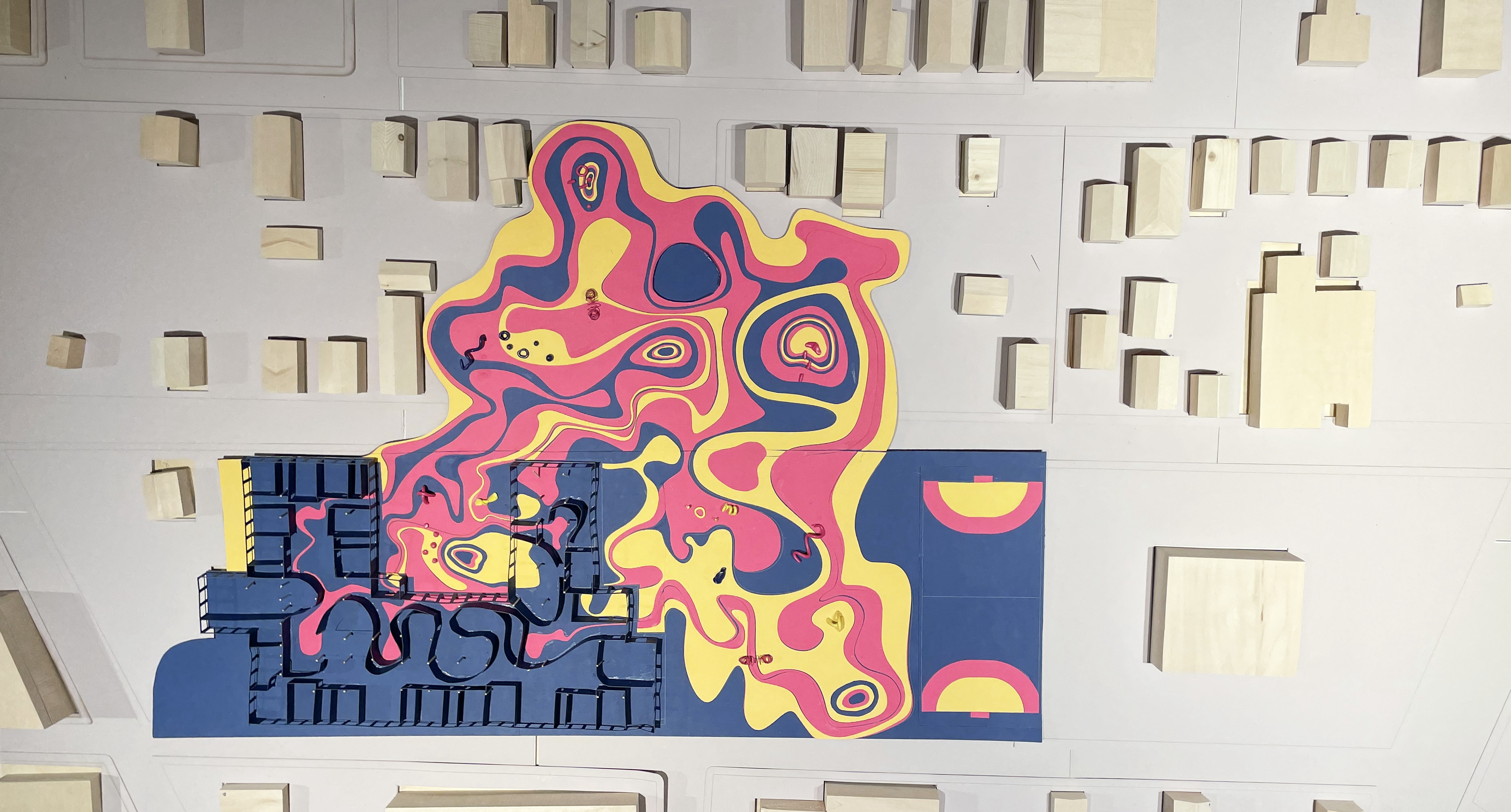 Playscape adaptively reuses the existing mill building on the site. The mill is currently built on a grid plan with equally spaced columns inside. The play landscape incorporates a system of curved lines that either obey or resist the existing grid system according to the program. The responsive system of curves dictates the circulation of the space and creates a dynamic child-friendly environment.